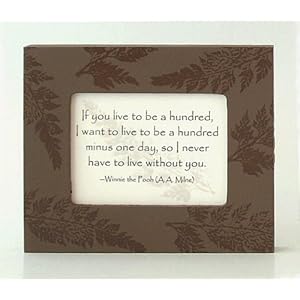 Find your favorite quotes here, framed in beautifully painted frames featuring swirls, fern leaves and dragonflies. Painted patterns on the frames allow you to group similarly colored frames while keeping each frame's pattern distinct. Available in 5" x 4", 9" x 7", and 13" x 9" sizes (sizes are exterior size of frame). Quote reads: If you live to be a hundred, / I want to live to be a hundred / minus one day, so I never / have to live without you. / Winnie the Pooh (A. A. Milne)